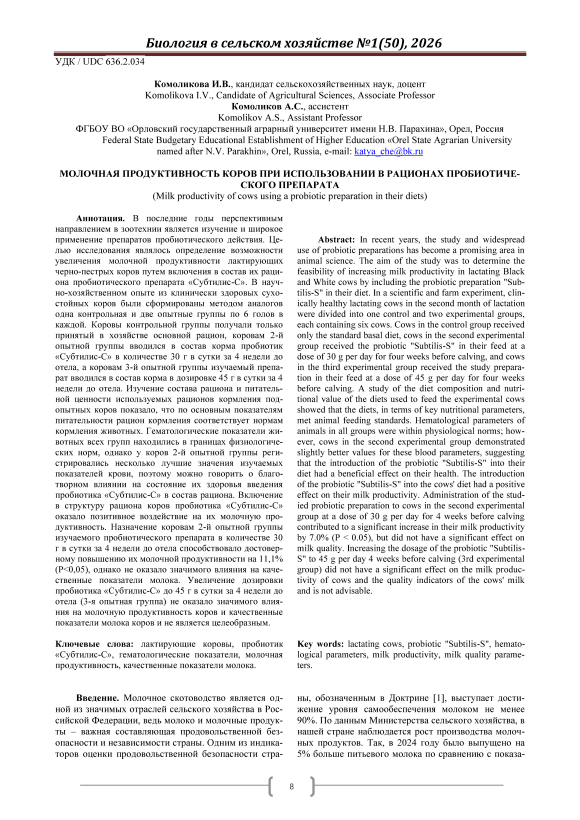 В последние годы перспективным направлением в зоотехнии является изучение и широкое применение препаратов пробиотического действия. Целью исследования являлось определение возможности увеличения молочной продуктивности лактирующих черно-пестрых коров путем включения в состав их рациона пробиотического препарата «Субтилис-С». В научно-хозяйственном опыте из клинически здоровых сухостойных коров были сформированы методом аналогов одна контрольная и две опытные группы по 6 голов в каждой. Коровы контрольной группы получали только принятый в хозяйстве основной рацион, коровам 2-й опытной группы вводился в состав корма пробиотик «Субтилис-С» в количестве 30 г в сутки за 4 недели до отела, а коровам 3-й опытной группы изучаемый препарат вводился в состав корма в дозировке 45 г в сутки за 4 недели до отела. Изучение состава рациона и питательной ценности используемых рационов кормления подопытных коров показало, что по основным показателям питательности рацион кормления соответствует нормам кормления животных. Гематологические показатели животных всех групп находились в границах физиологических норм, однако у коров 2-й опытной группы регистрировались несколько лучшие значения изучаемых показателей крови, поэтому можно говорить о благотворном влиянии на состояние их здоровья введения пробиотика «Субтилис-С» в состав рациона. Включение в структуру рациона коров пробиотика «Субтилис-С» оказало позитивное воздействие на их молочную продуктивность. Назначение коровам 2-й опытной группы изучаемого пробиотического препарата в количестве 30 г в сутки за 4 недели до отела способствовало достоверному повышению их молочной продуктивности на 11,1% (Р<0,05), однако не оказало значимого влияния на качественные показатели молока. Увеличение дозировки пробиотика «Субтилис-С» до 45 г в сутки за 4 недели до отела (3-я опытная группа) не оказало значимого влияния на молочную продуктивность коров и качественные показатели молока коров и не является целеобразным.