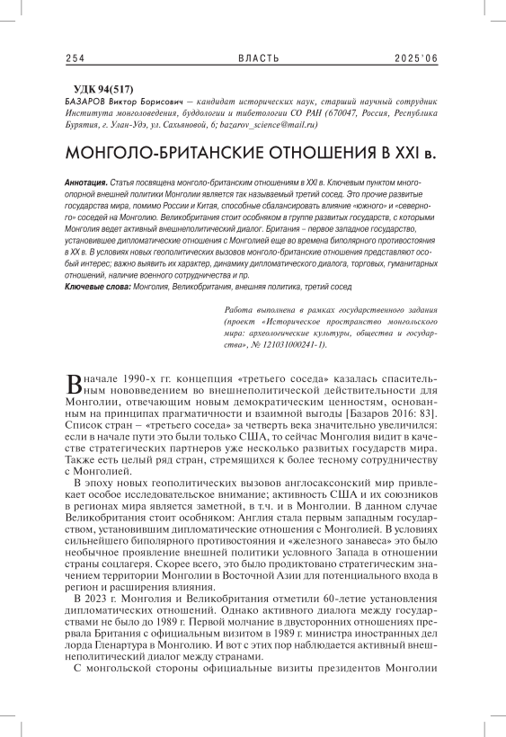 The article is devoted to Mongolian-British relations in the 21st century. The key point of Mongolia's multi-pillar foreign policy is the so-called third neighbor. These are other developed countries of the world in addition to Russia and China, capable of balancing the influence of the southern and northern neighbors on Mongolia. Great Britain stands apart in the group of developed countries with which Mongolia is actively engaged in foreign policy dialogue. Britain is the first Western country to establish diplomatic relations with Mongolia back in the days of the bipolar confrontation in the 20th century. In the context of new geopolitical challenges, Mongolian-British relations are of particular interest; it is important to identify the nature of their relations, the dynamics of diplomatic dialogue, trade, humanitarian relations, the presence of military cooperation, etc.