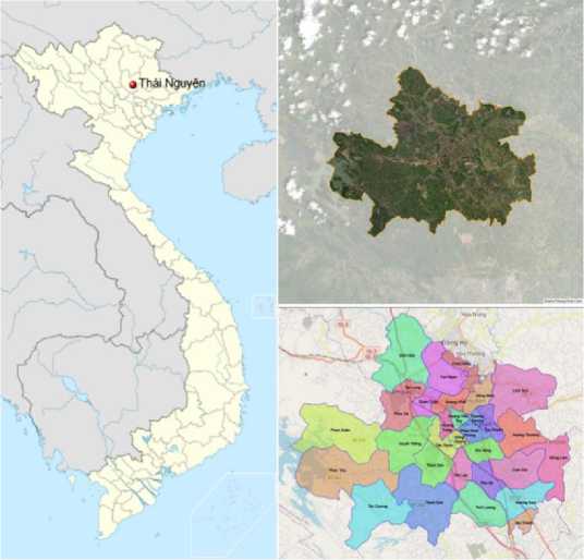 Город Тхайнгуен – административный, экономический и культурный центр одноименной провинции, расположен в северо-восточном среднегорном и горном регионе Вьетнама, примерно в 75 км к северу от столицы Ханой по трассе №3 (рис. 1). Географические координаты города находятся в диапазоне от 21°25' до 21°45' северной широты и от 105°45' до 106°00' восточной долготы. Город граничит: