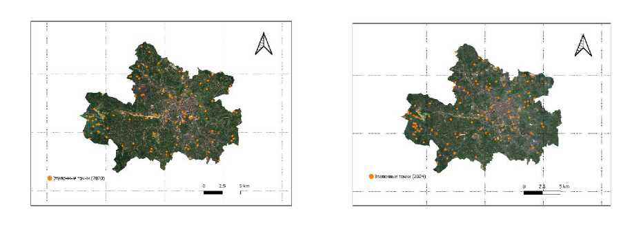 Результаты анализа изменений растительного покрова показывают, что общая площадь зеленых зон в городе практически не изменилась за период с 2020 по 2024 гг., однако произошли значительные изменения в структуре их распределения. Особенно заметно увеличение площади с низким уровнем покрытия растительностью, что связано с расширением урбанизированных территорий и активным развитием сельскохозяйственных земель. Эти изменения свидетельствуют о процессе деградации зеленых территорий, вызванного интенсивной урбанизацией и утратой природных экосистем в условиях роста города. Преобразования в распределении растительности требуют особого внимания, так как они могут свидетельствовать о потерях экосистемных услуг, таких как поддержание биоразнообразия, улучшение качества воздуха и воды, а также создание природных коридоров для фауны.