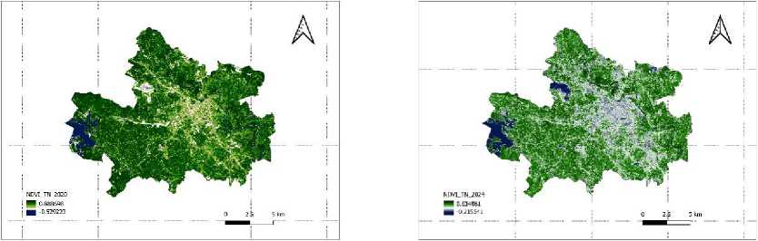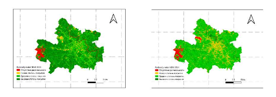 Анализ пространственного распределения растительности на основе индекса NDVI за 2020 и 2024 гг. выявил следующие изменения в степени покрытия на территории г. Тхайнгуен. Результаты показывают значительные изменения в структуре растительного покрова, которые можно детализировать следующим образом: