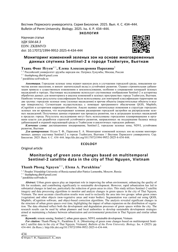 Многоспектральный инструмент (MSI) спутника Sentinel-2 предоставляет информацию о площади и состоянии растительного покрова, позволяя выявлять тенденции и изменения во времени. Цель настоящего исследования – применить данную технологию для анализа изменений площади и качества зеленых зон г. Тхайнгуен, а также предоставить данные для устойчивого городского планирования.