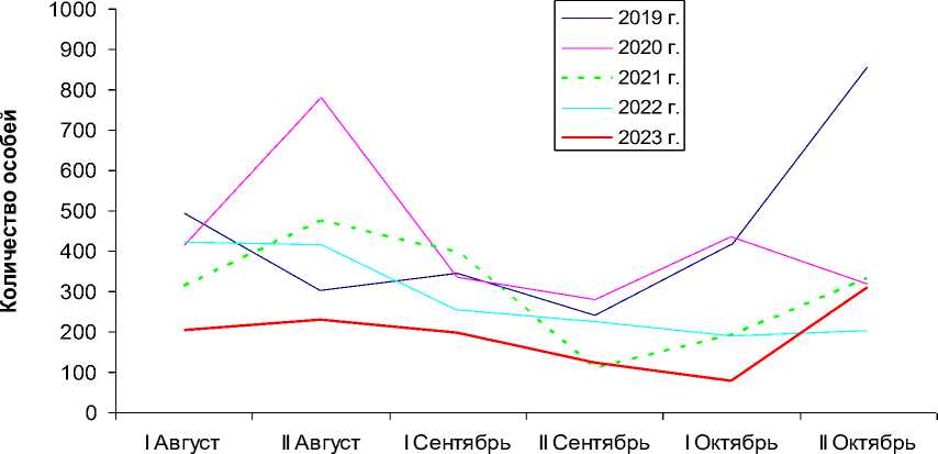 Рис. 2. Динамика численности лимнофильных птиц в заповеднике «Ягорлык» в осенние периоды 2019-2023 годов