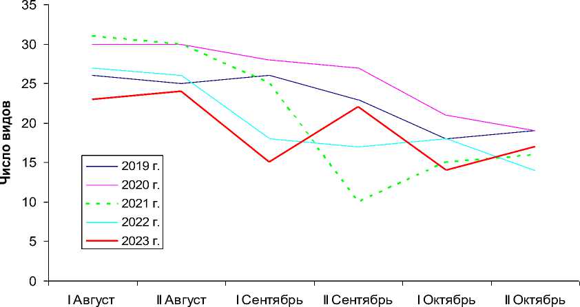 Рис. 3. Динамика видового состава лимнофильных птиц в заповеднике «Ягорлык» в осенние периоды 2019-2023 годов