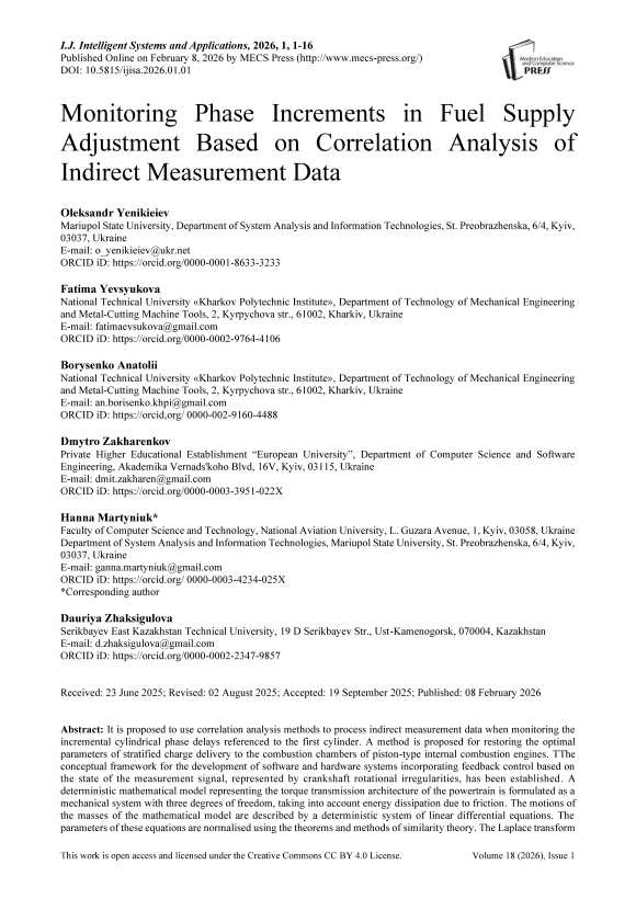 It is proposed to use correlation analysis methods to process indirect measurement data when monitoring the incremental сylindrical phase delays referenced to the first cylinder. A method is proposed for restoring the optimal parameters of stratified charge delivery to the combustion chambers of piston-type internal combustion engines. TThe conceptual framework for the development of software and hardware systems incorporating feedback control based on the state of the measurement signal, represented by crankshaft rotational irregularities, has been established. A deterministic mathematical model representing the torque transmission architecture of the powertrain is formulated as a mechanical system with three degrees of freedom, taking into account energy dissipation due to friction. The motions of the masses of the mathematical model are described by a deterministic system of linear differential equations. The parameters of these equations are normalised using the theorems and methods of similarity theory. The Laplace transform under zero initial conditions is applied to solve the resulting system of differential equations. Using the method of determinants and the Mathcad software environment, the information links between the cylinder torques and the signal of uneven rotation of the first crankshaft mass were established. In the Matlab software environment, special points were identified and a simplified representation of the torque transfer functions was obtained as a result of their analysis. A limited Fourier series using Mathcad software approximated the cylinder torques. A computational scheme was developed for simulating deterministic signals characterizing the rotational irregularity of the first crankshaft mass. The additive disturbance superimposed on the measurement signal is modeled as structured white noise with a frequency spectrum constrained to ten harmonic components. Within the computer modeling framework, the output signal generation utilizes an approach based on the regulation of information pathway lengths in neural network structures to define the gain coefficients corresponding to the aggregated torque amplitudes of individual cylinders. For the first time, an auxiliary algorithm was developed to monitor incremental phase delays of the cylinders relative to the reference (first) cylinder by calculating the mutual correlation function between the rotational irregularity signal of the first crankshaft mass and the torque output of the first cylinder. The software application for calculating the reciprocal correlation function is implemented in the program Mathcad. As a result of the analysis of the mutual correlation function graph, three distinct maxima were identified. The initial peak of the computed mutual correlation function corresponds to the phase associated with the nominal torque generation of the second combustion chamber. The second peak reflects the standard torque phase of the third chamber, while the third peak indicates the reference phase for the first combustion unit. Furthermore, the proportional values of these maxima align with the gain factors assigned to each cylinder's torque in the computational summation scheme. The cross-correlation between the processed measurement signal and the torque signal of the first cylinder was evaluated under conditions of additive stochastic interference. Analysis of the correlation curve demonstrates that a measurement uncertainty of approximately 14% in the rotational non-uniformity of the primary crankshaft mass does not preclude the effective application of correlation analysis techniques for phase shift tracking in the fuel delivery timing across engine cylinders.