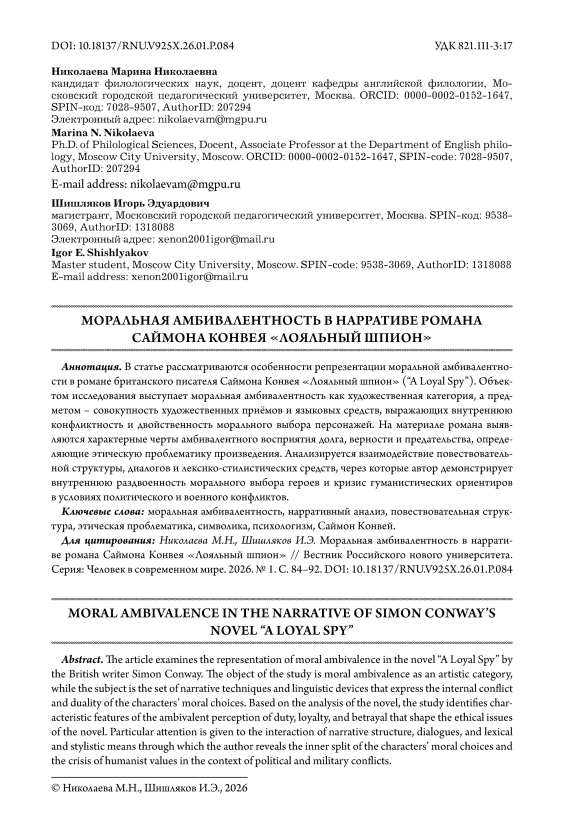 В статье рассматриваются особенности репрезентации моральной амбивалентности в романе британского писателя Саймона Конвея «Лояльный шпион» (“A Loyal Spy”). Объектом исследования выступает моральная амбивалентность как художественная категория, а предметом – совокупность художественных приёмов и языковых средств, выражающих внутреннюю конфликтность и двойственность морального выбора персонажей. На материале романа выявляются характерные черты амбивалентного восприятия долга, верности и предательства, определяющие этическую проблематику произведения. Анализируется взаимодействие повествовательной структуры, диалогов и лексико-стилистических средств, через которые автор демонстрирует внутреннюю раздвоенность морального выбора героев и кризис гуманистических ориентиров в условиях политического и военного конфликтов.