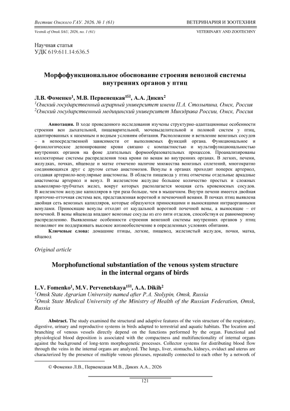 Морфофункциональное обоснование строения венозной системы внутренних органов у птиц