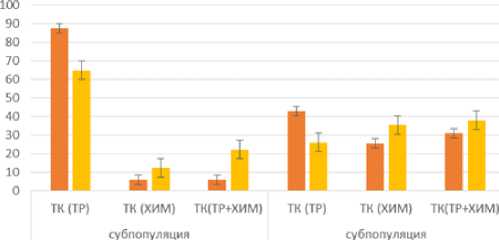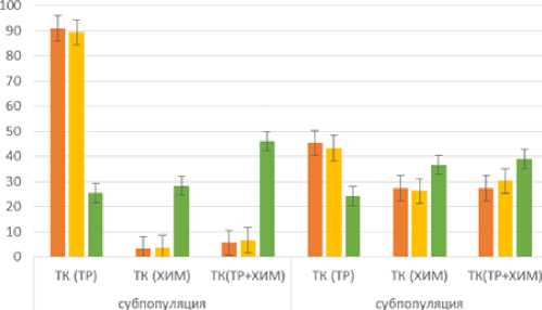 Одновременно увеличилась численность хло-рацетатэстераза-позитивных ТК, химаза-позитивных ТК и клеток, маркируемых CD117+ (табл. 1). Важно отметить, что повышение численности ТК, содержащих хлорацетатэстеразу и химазу, проявлялось статистически значимо как в абсолютных показателях, так и в относительных, по сравнению с условиями синхронного эксперимента.