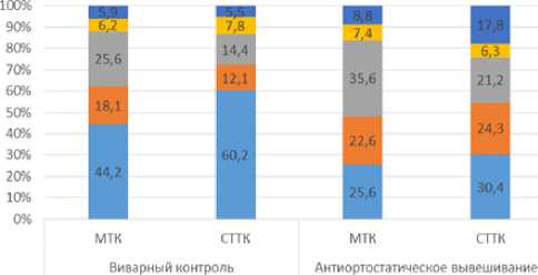 В рамках эксперимента заметно усилились процессы высвобождения биоактивных веществ, что отразилось снижением доли недегранулиро-ванных ТК в слизистой оболочке и увеличением числа клеток, находящихся в стадии активного экзоцитоза и распада гранул (рис. 4). Увеличилось образование множественных кластеров из ТК, представленных клетками с разными уровнями морфологической зрелости и функциональной активности. Повысился процент клеток с гамма-метахромазией.