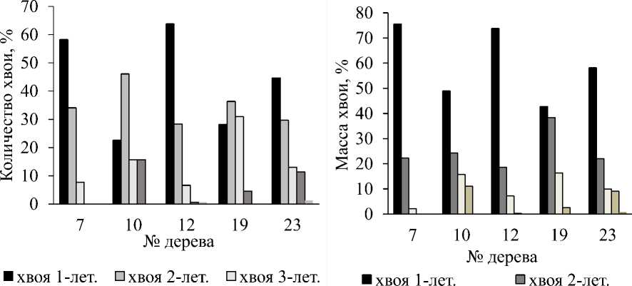 – на модельных деревьях сосны 1-летняя хвоя, как правило, преобладает как по количеству, так и по массе;