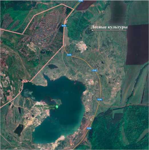 Рис. 1. Картосхема карьерно-отвального комплекса Кумертауского буроугольного разреза (Россия, Республика Башкортостан). Отмечено местоположение участка лесной рекультивации (URL: ; находится в открытом доступе)