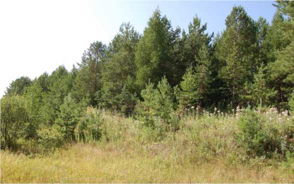 Рис. 2. Лесные культуры и естественное возобновление сосны обыкновенной ( Pinus sylvestris L.) на отвалах Кумертауского буроугольного разреза на участке, прилегающем к лесным культурам
