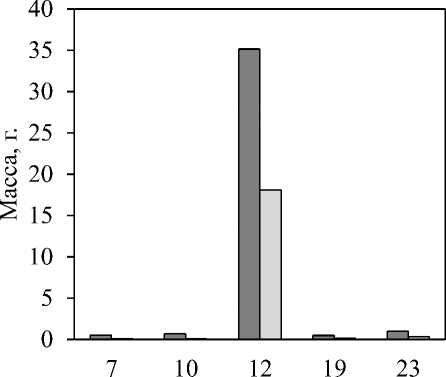 Как следует из рис. 5, 1-летняя хвоя в количественном отношении не всегда преобладает у модельных растений. У модельных деревьев № 10 и № 19 доминирует 2-летняя хвоя. При этом по массе у всех сеянцев сосны доминирует 1-летняя хвоя. Следует отметить, что наличие у модельных растений как 2- и 3-летней хвои является нормой для сосны обыкновенной. Факт сохранения хвои сосны до возраста 4 и 5 лет – показатель приспособления к экстремальным условиям произрастания.