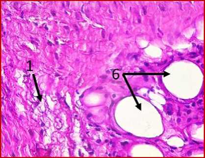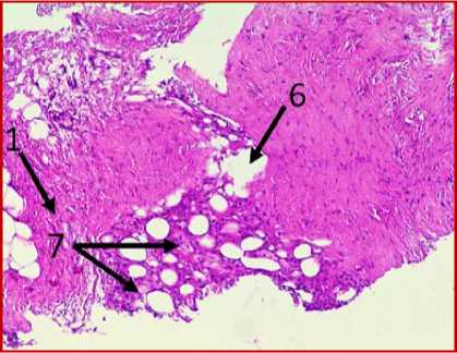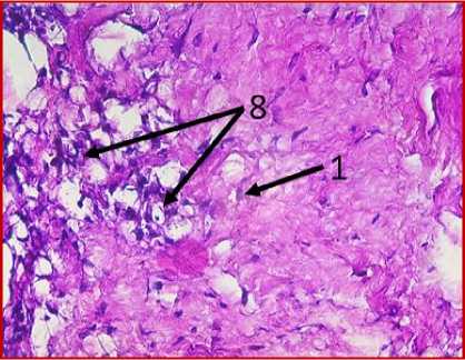 На двух гистологических снимках отмечались также участки жировой ткани (обозначено цифрой «6» на рис. 1 под буквами А, В, Е, Ж) с воспалительноклеточной инфильтрацией, представленной макрофагами (обозначено цифрой «7» на рис. 1 под буквами А, Е) и лимфоцитами (обозначено цифрой «8» на рис. 1 под буквами В, З), что может свидетельствовать о незначительном отеке соединительной ткани с признаками пролиферативного воспаления. Таким образом, на всех представленных микрофото гистологических препаратов тканей послеоперационных рубцов пациентов на рис. 1, окрашенных железным гематоксилином, отмечался процесс формирования гиали-зированного рубца, однако его формирование еще не завершено, так как присутствуют признаки пролиферативного воспаления, которое должно завершиться образованием рубца.