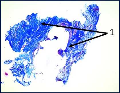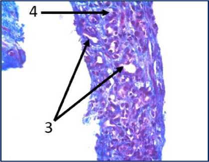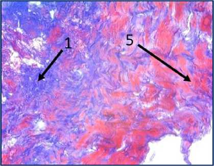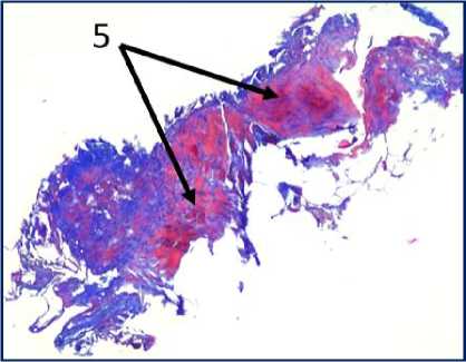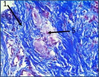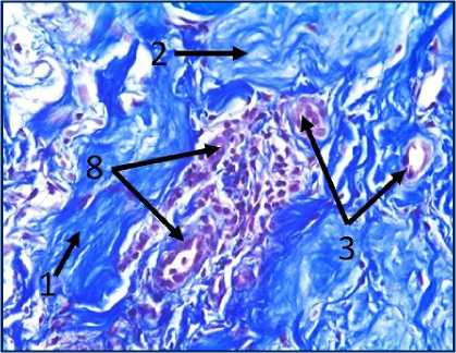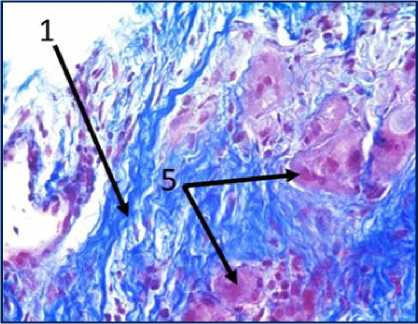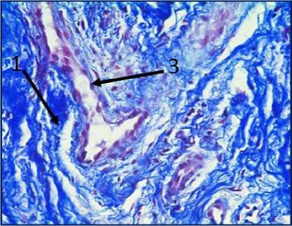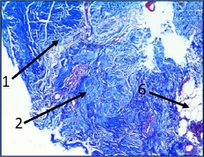Рис. 3. Микрофото гистологических препаратов тканей послеоперационного рубца. Окр.: «трихромом по Массону». Ув.: х400. Обозначения и пояснения см. в тексте статьи