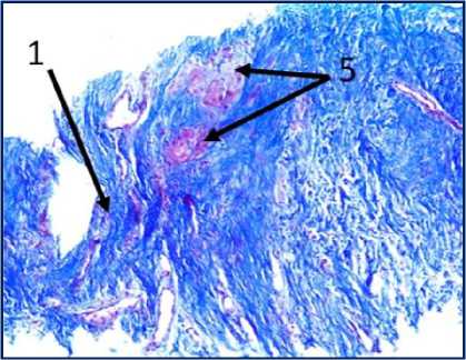 Рис. 2. Микрофото гистологических препаратов тканей послеоперационного рубца. Окр.: «трихромом по Массону». Ув.: х400. Обозначения и пояснения см. в тексте статьи