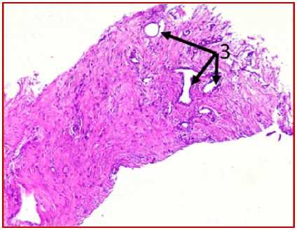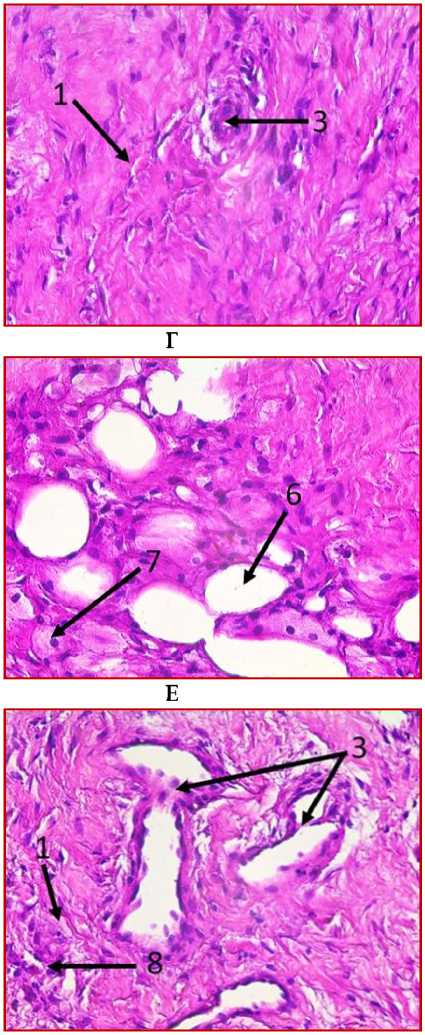 исследуемом материале (ткани послеоперационного рубца) с помощью окраски железным гематоксилином и красителем ОКГ были выявлены фрагменты волокнистой соединительной ткани, представленные зрелыми коллагеновыми волокнами (обозначено цифрой «1» на рис. 1 под буквами А, В, Г, Д, Ж, З) с участками неоангиогенеза, представленными вновь образованными сосудами (обозначено цифрой «3» на рис. 1 под буквами Б, Г, З).