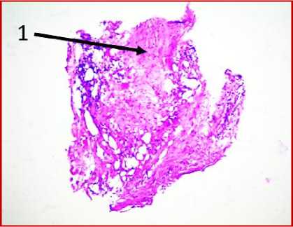 На 14 сутки после операции выполнили ультразвуковое исследование послеоперационного рубца, анализировали регенеративные процессы и отмечали отсутствие послеоперационной серомы. Материал для биопсии взят из толщи рубца брюшной стенки, как можно ближе к трансплантату. Биопсийный материал пациента характеризовался наличием зрелого коллагена ткани послеоперационного рубца, минимальной лейкоцитарной инфильтрацией, формированием плотного гиалинизированного рубца и наличием участков неоангиогенеза, представленных вновь образованными сосудами, что, также, как и в случае с первым пациентом, указывало на неосложненное течение раневого процесса и достаточном качестве выполненной вентропластики. Отдаленные результаты оценивались в проспективном исследовании в течение года. Рецидива грыжи также выявлено не было.