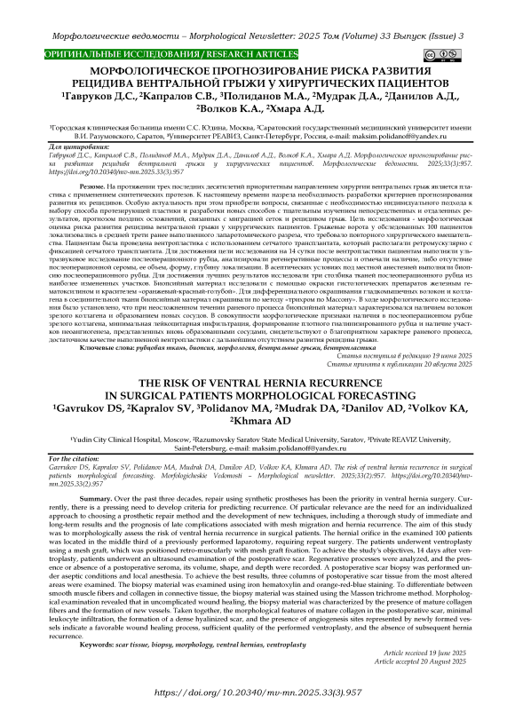 Gavrukov DS, Kapralov SV, Polidanov MA, Mudrak DA, Danilov AD, Volkov KA, Khmara AD. The risk of ventral hernia recurrence in surgical patients morphological forecasting. Morfologicheskie Vedomosti – Morphological newsletter. 2025;33(2):957. (2).957