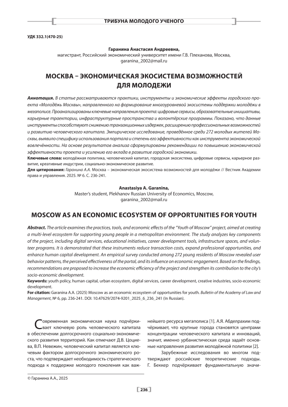 The article examines the practices, tools, and economic effects of the “Youth of Moscow” project, aimed at creating a multi-level ecosystem for supporting young people in a metropolitan environment. The study analyzes key components of the project, including digital services, educational initiatives, career development tools, infrastructure spaces, and volunteer programs. It is demonstrated that these instruments reduce transaction costs, expand professional opportunities, and enhance human capital development. An empirical survey conducted among 272 young residents of Moscow revealed user behavior patterns, the perceived effectiveness of the portal, and its influence on economic engagement. Based on the findings, recommendations are proposed to increase the economic efficiency of the project and strengthen its contribution to the city’s socio-economic development.