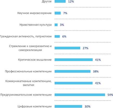 Респонденты считают, что предпринимательские компетенции (54%) наиболее важны для технологического предпринимателя (рис. 12) . В равной степени (по 41%) важны критическое мышление и коммуникативные компетенции, эмпатия. Профессиональные компетенции отметили 38% опрошенных студентов. Достаточно низко оценены нравственная культура (3%), гражданская активность (6%) и научное мировоззрение (7%). Это показывает, что респонденты не полностью понимают сущность технологического предпринимательства, которое базируется на науке, а также недооценивают важность социальных аспектов ведения бизнеса, его имиджа.