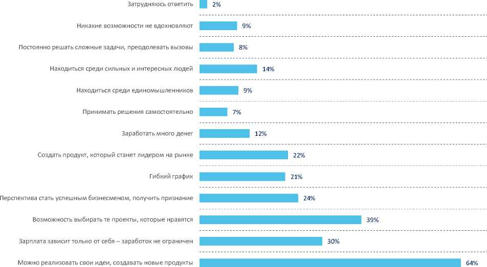 На рис. 4 представлено распределение ответов на вопрос «Какие возможности Вас вдохновляют, когда Вы думаете о технологическом бизнесе?». В качестве основного мотива респонденты отмечают возможность реализовать свои идеи, создавать новые продукты (64%), а на втором месте по важности находится возможность выбирать и реализовывать те проекты, которые интересны (39%). Таким образом, наиважнейшим мотивом является творческая свобода в области технологического предпринимательства. Далее респонденты отмечают следующие важные мотивы: заработок зависит только от предпринимателя (30%), перспективы стать успешным предпринимателем и получить признание (24%).