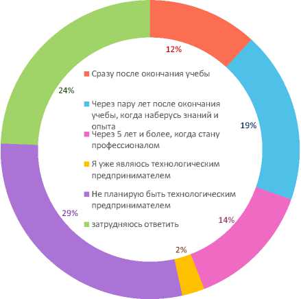 Ответы на вопрос о планах стать технологическим предпринимателем распределились следующим образом (рис. 5) : 2% респондентов уже являются технологическими предпринимателями, 45% планируют создать технологический бизнес в разном временном периоде и только 53% не планируют развиваться в этом направлении или затруднились ответить. Полученные данные совпадают с данными международного