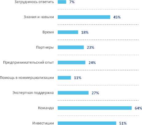 Интересно, что респонденты главным ресурсом для технологического бизнеса считают команду (64%), а наличие инвестиций отмечают 51% студентов (рис. 10) . Важным ресурсом является и наличие необходимых компетенций (45%). В связи с тем, что сегодня активно продвигается образовательный контент в области коммерциализации инноваций, помощь в коммерциализации важна только для 11% респондентов.