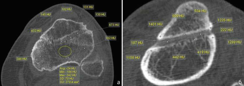 Рис. 1. МСКТ голени пациентки 50 лет со СО, аксиальные срезы: а — определение плотности кости и содержимого спицевого канала; б — определение плотности стенок спицевого канала