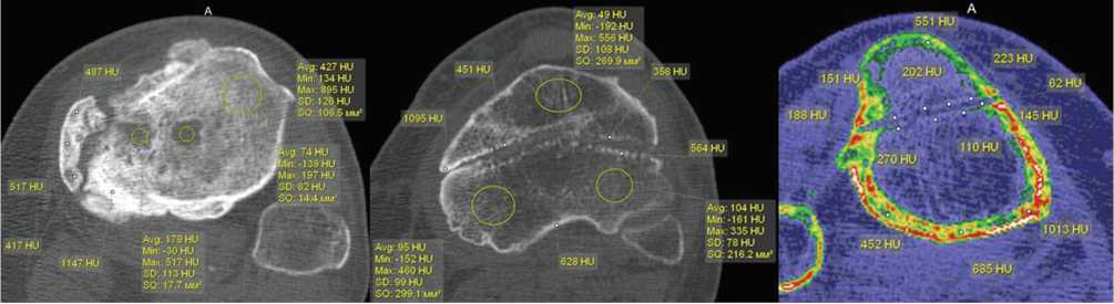 Исследования выполняли на компьютерных томографах Toshiba Aquilion-64, GE Lihgt Speed VCT. Измеряли общую и локальную плотность кости (HU) в различных отделах. Изучали строение кости в зоне воспаления, характер спицевого канала с анализом аксиальных срезов и мультипланарных реконструкций (MPR) в сагиттальной и коронарной проекциях бедренной и большеберцовой костей (855 изобра- жений). Количественно оценивали плотность кости (в единицах Хаунсфилда, HU) в зоне воспаления, анализировали морфологию спицевых каналов (ширина, контуры стенок, наличие секвестров). В контрольной группе, где не было осложнений , определяли ширину спицевого канала после удаления спиц.
