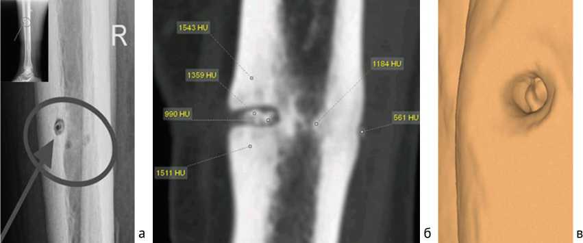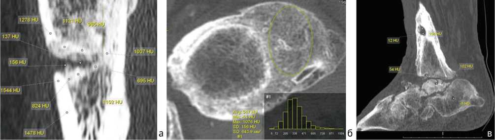 Спицевой канал был шире в области кортикальной пластинки. Плотность стенок спицевого канала увеличивалась до 480 [420;620] HU (медиана) (рис. 4, а). При локализации СО в дистальной трети большеберцовой кости и длительном течении заболевания (больше года) изменения в данной области проявлялись участками деструкции, нарушением структуры кости, появлением зон разрежения и склероза. Во всех случаях воспалительный и деструктивный процесс распространялся на кости стопы, сопровождаясь дефектами, изменением структуры с нарушением органотипического строения костей, зонами резорбции (рис. 4, б, в).