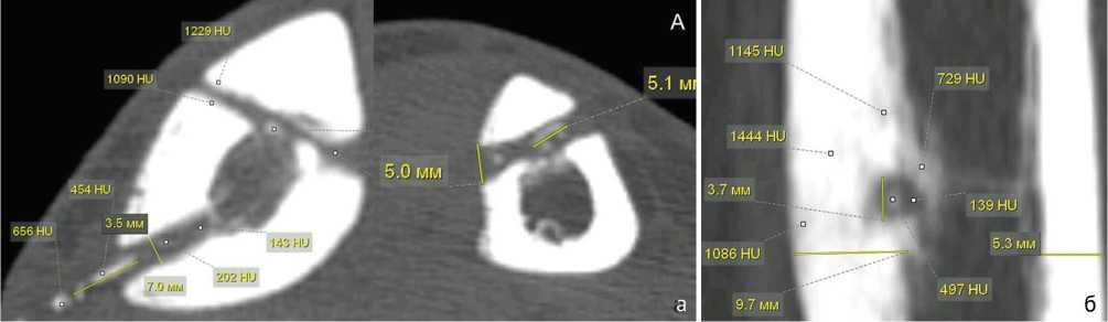 Рис. 5. МСКТ голени пациентов 36 лет (а) и 42 лет (б) со СО. Ширина спицевого канала: а — аксиальный срез; б — MPR в сагиттальной плоскости