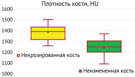 На рис. 7 представлена плотность некротизированных и неизмененных участков кости. Медиана для некротизированной кости — 1388 [1315;1430], для неизмененной кости — 1248 [1198;1302] ( p < 0,05).