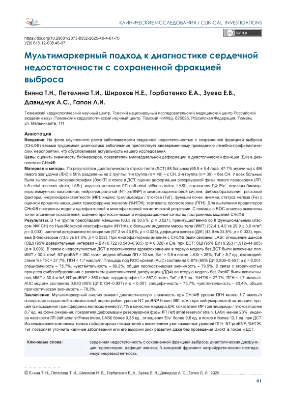 Мультимаркерный подход к диагностике сердечной недостаточности с сохраненной фракцией выброса