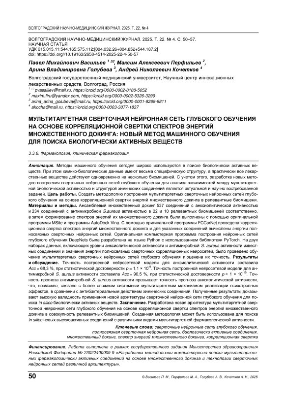 Мультитаргетная сверточная нейронная сеть глубокого обучения на основе корреляционной свертки спектров энергий множественного докинга: новый метод машинного обучения для поиска биологически активных веществ