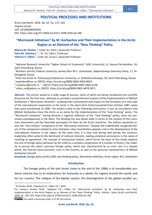 Marina M. Panikar, Flera Kh. Sokolova, Viktoria V. Vilken. “Murmansk Initiatives” … dressed topics related to the place and role of the Arctic in the formation of M.S. Gorbachev’s “new thinking” concept, as well as its consequences for the development of international processes in the region, which makes this study particularly relevant.