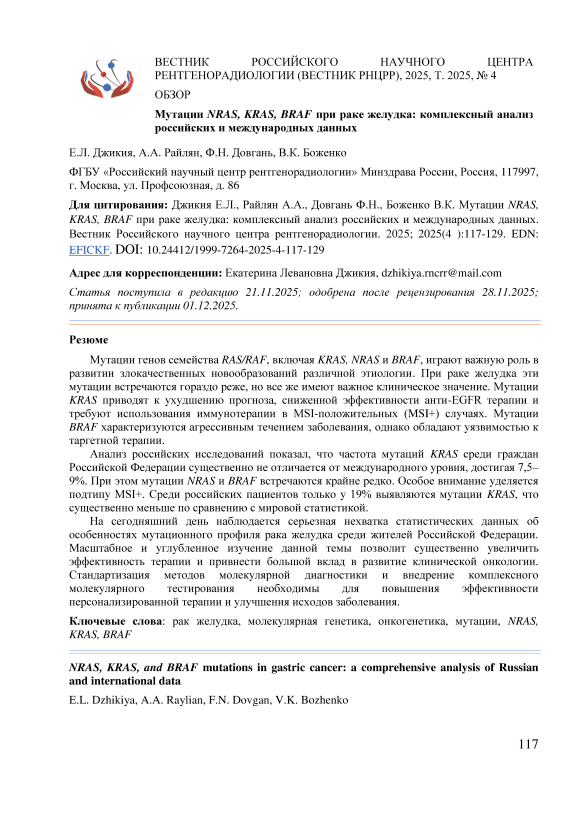 Мутации генов семейства RAS/RAF, включая KRAS, NRAS и BRAF, играют важную роль в развитии злокачественных новообразований различной этиологии. При раке желудка эти мутации встречаются гораздо реже, но все же имеют важное клиническое значение. Мутации KRAS приводят к ухудшению прогноза, сниженной эффективности анти-EGFR терапии и требуют использования иммунотерапии в MSI-положительных (MSI+) случаях. Мутации BRAF характеризуются агрессивным течением заболевания, однако обладают уязвимостью к таргетной терапии. Анализ российских исследований показал, что частота мутаций KRAS среди граждан Российской Федерации существенно не отличается от международного уровня, достигая 7,5–9%. При этом мутации NRAS и BRAF встречаются крайне редко. Особое внимание уделяется подтипу MSI+. Среди российских пациентов только у 19% выявляются мутации KRAS, что существенно меньше по сравнению с мировой статистикой. На сегодняшний день наблюдается серьезная нехватка статистических данных об особенностях мутационного профиля рака желудка среди жителей Российской Федерации. Масштабное и углубленное изучение данной темы позволит существенно увеличить эффективность терапии и привнести большой вклад в развитие клинической онкологии. Стандартизация методов молекулярной диагностики и внедрение комплексного молекулярного тестирования необходимы для повышения эффективности персонализированной терапии и улучшения исходов заболевания.