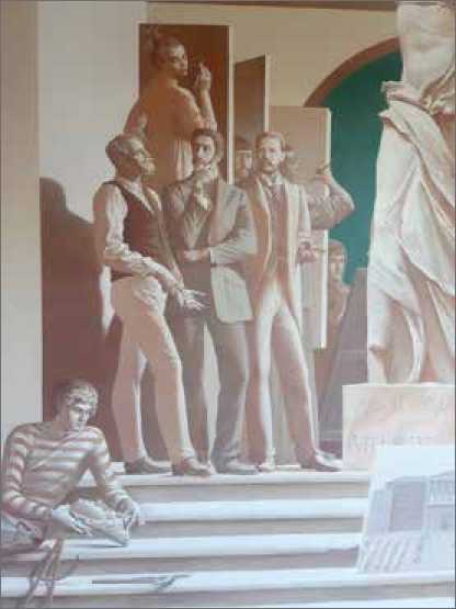 К юбилейной дате, 200-летию учебного заведения, в 2025 г., как и в предыдущие несколько лет, проводится цикл различных мероприятий, и выпускники университета подготовили значимые дипломные работы. Так, студентами VI курса кафедры монументально-декоративной живописи, была выполнена монументальную роспись «Летопись университета имени Строганова», отражающая вехи истории учебного заведения. Официальное открытие этой росписи состоялось 9 апреля 2025 г.1 В центре монументальной композиции изображён символ искусства — скульптура Ники Самофракийской, на подиуме которой высечена крылатая латинская фраза: «Ars longa, Vita brevis» (Жизнь коротка, искусство вечно). В центральной части композиции (Илл. 1) представлены корифеи университета: К.А. Коровин, М.А. Врубель, Ф.О. Шехтель, а также О.П. Филат-чев, выпускник факультета монументальной живописи Строгановского училища, преподаватель и яркий представитель Строгановской школы советского периода, который в сорок лет был удостоен звания академика.