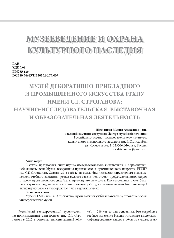 Музей декоративно-прикладного и промышленного искусства РГХПУ имени С.Г. Строганова: научно-исследовательская, выставочная и образовательная деятельность