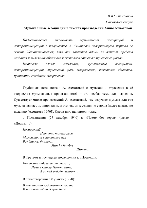 Ахматова, музыкальные ассоциации, автореминисценции, лирический цикл, макротекст, текстовое единство, прототип, «позднее» творчество, Akhmatova, musical associations, autoreminiscences, lyrical cycle, macrotext, textual unity, prototype, final period of creative activity