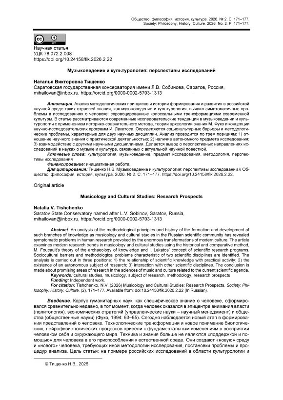 An analysis of the methodological principles and history of the formation and development of such branches of knowledge as musicology and cultural studies in the Russian scientific community has revealed symptomatic problems in human research provoked by the enormous transformations of modern culture. The article examines modern research trends in musicology and cultural studies using the historical and comparative method, M. Foucault’s theory of the archaeology of knowledge and I. Lakatos’ concept of scientific research programs. Sociocultural barriers and methodological problems characteristic of two scientific disciplines are identified. The analysis is carried out in three positions: 1) the relationship of scientific knowledge with practical activity; 2) the existence of an autonomous subject of research; 3) interaction with other scientific disciplines. The conclusion is made about promising areas of research in the sciences of music and culture related to the current scientific agenda.