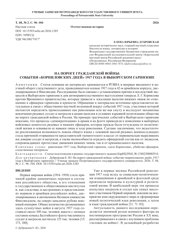 Статья основана на материалах хранящегося в РГВИА и впервые вводимого в научный оборот следственного дела, проводившегося осенью 1917 года в 42-м армейском корпусе, дислоцированном в Финляндии. Расследование было связано с установлением причин и последствий эксцессов в Выборгском гарнизоне в дни антиправительственного выступления генерала Л. Г. Корнилова против Временного правительства, которые привели к эскалации насилия нижних чинов по отношению к офицерам гарнизона и крепости. Обращение к материалам источника представляется актуальным в связи с общественно-научной полемикой вокруг событий 1917 года, участники которой пытаются определить происходившее как революцию или же как смуту и исследуют механизмы вовлечения рядовых солдат и матросов в акции насилия в условиях взрывной политизации общества на пороге гражданской войны в России. На примере трагических событий в Выборгском гарнизоне показано, что процессы «демократизации» в армии и на флоте приводили к появлению в выборных войсковых комитетах рядовых и нижних офицеров, которые прежде были отчуждены от политической жизни и осваивали ее навыки лишь в ходе революции. Сделано заключение, что недостаточно реализованная возможность поиска общего языка с основной массой рядовых военнослужащих стала причиной оторванности представителей «комитетского класса» от первоначально выразивших им доверие солдат и матросов, а также неспособности оградить офицерский состав как от эксцессов, сопровождавших протестные движения нижних чинов, так и от криминального насилия.