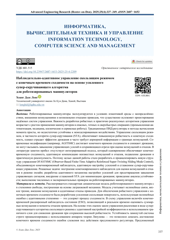 Введение. Роботизированные манипуляторы эксплуатируются в условиях изменчивой среды с неопределённостями, внешними возмущениями и возможными отказами приводов, что существенно осложняет проектирование надёжных систем управления. Важность разработки робастных и практично реализуемых алгоритмов управления возрастает с ростом применения манипуляторов в опасных, точных и сверхбыстрых операциях (промышленная автоматизация, медицина, космические и сервисные роботы). Традиционные ПИД-регуляторы и методы вычисления момента просты, но недостаточно устойчивы к немоделированным воздействиям. Управление скользящим режимом, в частности алгоритм супер-скручивания (STA), обеспечивает повышенную робастность и конечную сходимость, однако страдает эффектом дрожания и часто требует априорной информации о границах возмущений. Современные модификации (например, AGITSMC) достигают конечного времени сходимости и снижают дрожание, но могут вызывать завышение управляющих усилий и сохраняющиеся огрехи при оценке возмущений и отказов. В литературе заметен пробел: отсутствует интегрированный подход, который одновременно обеспечивает конечновременную сходимость, адаптивную компенсацию неизвестных возмущений и отказов, подавление дрожания и практическую реализуемость. Поэтому целью данной работы стало разработать и проанализировать новую структуру управления OFASTSMC (Observer-Based Finite-Time Adaptive Reinforced Super-Twisting Sliding Mode Control), объединяющую конечновременный наблюдатель, адаптивную настройку усилений и сглаженное супер-скручивающее управление. Решаемые задачи: построение конечновременного наблюдателя для оценки возмущений и отказов в режиме онлайн; разработка адаптивного механизма настройки усилений для предотвращения завышения управляющих сигналов; внедрение сглаженной STA для минимизации дрожания; проведение анализа устойчивости; выполнение численных и экспериментальных проверок на роботизированных манипуляторах. Материалы и методы. Рассматривается стандартная динамическая модель роботизированного манипулятора с n степенями свободы, построенная на основе лагранжевой механики. Модель учитывает нелинейные связи, вязкое трение, внешние возмущения и аддитивные отказы приводов. Для обеспечения робастного управления с конечным временем сходимости была разработана усиленная скользящая поверхность, использующая нелинейные ошибки с адаптивными степенями — это ускоряет процесс сходимости. В схему управления включён конечновременной расширенный наблюдатель состояния (ESO), позволяющий в реальном времени оценивать суммарные возмущения и моменты отказов приводов. На основе этих оценок закон управления реализован в виде суперскручивающего алгоритма скользящего режима с адаптивной настройкой коэффициентов и использованием граничного слоя для снижения дрожания при сохранении высокой робастности. Устойчивость замкнутой системы строго проанализирована с использованием аппарата теории Ляпунова — это позволило доказать достижение конечного времени сходимости ошибок слежения под действием предложенного регулятора. Предложенный алгоритм OFASTSMC реализован в среде MATLAB/Simulink и проверен на примере плоского роботизированного манипулятора с двумя степенями свободы. Манипулятор подвергался действию переменных возмущений и сценариев д