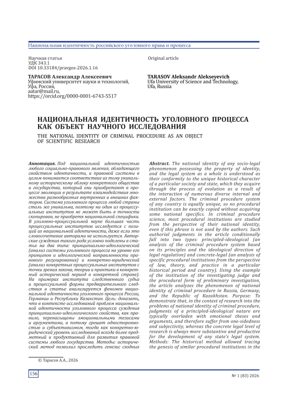 The national identity of any socio-legal phenomenon possessing the property of identity, and the legal system as a whole is understood as their conformity to the unique historical character of a particular society and state, which they acquire through the process of evolution as a result of the interaction of numerous diverse internal and external factors. The criminal procedure system of any country is equally unique, so no procedural institution can be exactly copied without acquiring some national specifics. In criminal procedure science, most procedural institutions are studied from the perspective of their national identity, even if this phrase is not used by the authors. Such authorial judgments in the article conditionally fall into two types: principled-ideological (an analysis of the criminal procedure system based on its principles and the ideological direction of legal regulation) and concrete-legal (an analysis of specific procedural institutions from the perspective of law, theory, and practice in a particular historical period and country). Using the example of the institution of the investigating judge and the procedural form of preliminary investigation, the article analyzes the phenomenon of national identity of criminal procedure in Russia, Germany, and the Republic of Kazakhstan. Purpose: To demonstrate that, in the context of research into the problems of national identity of criminal procedure, judgments of a principled-ideological nature are typically overladen with emotional theses and arguments, and therefore suffer from one-sidedness and subjectivity, whereas the concrete legal level of research is always more substantive and productive for the development of any state’s legal system. Methods: The historical method allowed tracing the genesis of similar procedural institutions in the history of different legal systems. The comparative legal method was used to demonstrate the national uniqueness of similar socio-legal phenomena. The concrete legal method enabled a substantive analysis of the relationship between regulatory legal provisions and the practice of implementing individual procedural norms and institutions. Results: The article formulates and substantiates the conclusion that one-sided (both positive and negative) assessments of the historical experience and current state of national criminal justice systems are inadmissible, as their inherent subjectivity leads to the repeated recurrence of crisis phenomena in the future.