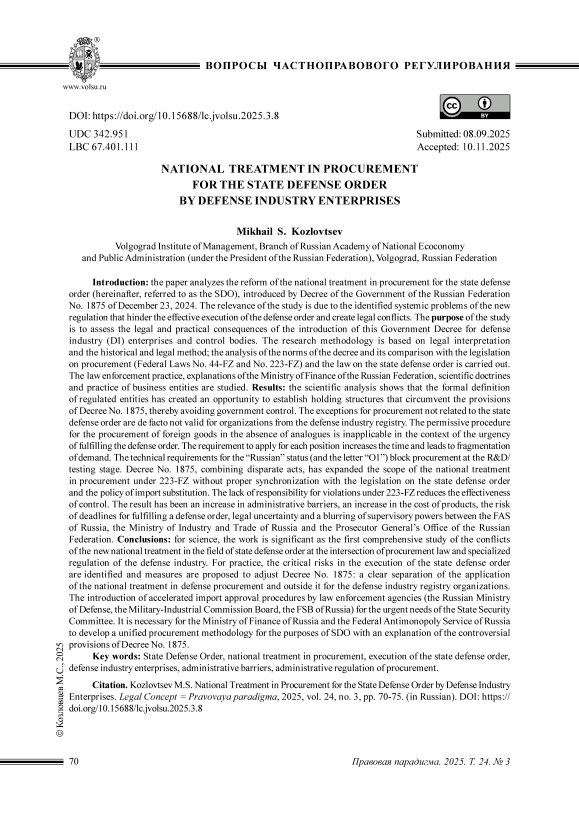 Введение: статья анализирует реформу национального режима в закупках для государственного оборонного заказа, введенную Постановлением Правительства РФ № 1875 от 23 декабря 2024 года. Актуальность исследования обусловлена выявленными системными проблемами нового регулирования, препятствующими эффективному исполнению оборонного заказа и создающими правовые коллизии. Цель исследования: оценка правовых и практических последствий введения указанного Постановления Правительства для предприятий оборонно-промышленного комплекса и органов контроля. Методология исследования опирается на юридическое толкование и историко-правовой метод; проведен анализ норм постановления и его сопоставление с законодательством о закупках (федеральные законы № 44-ФЗ и № 223-ФЗ) и законом о государственном оборонном заказе (ГОЗ). Изучена правоприменительная практика, разъяснения Министерства финансов РФ, научная доктрины и практика хозяйствующих субъектов. Результаты: научный анализ показал, что формальное определение субъектов регулирования привело к возможности создания таких холдинговых структур, которые позволяют уйти от действия Постановления Правительства РФ № 1875 от 23 декабря 2024 г., исключая таким образом государственный контроль. Исключения для закупок, не связанных с государственным оборонным заказом, де-факто не действуют для организаций из реестра оборонно-промышленного комплекса. Разрешительный порядок закупки иностранных товаров при отсутствии аналогов неприменим в условиях срочности исполнения оборонного заказа. Требование оформления заявок на каждую позицию увеличивает сроки и приводит к дроблению потребности. Технические требования к «российскому» статусу (и литера «О1») блокируют закупки на стадии научно-исследовательских и опытно-конструкторских работ / испытаний. Постановление № 1875, объединив разрозненные акты, расширило сферу действия национального режима на закупки по 223-ФЗ без должной синхронизации с законодательством о государственном оборонном заказе и политикой импортозамещения. Отсутствие ответственности за нарушения по 223-ФЗ снижает действенность контроля. Следствием стали рост административных барьеров, удорожание продукции, риск срыва сроков выполнения оборонного заказа, правовая неопределенность и размывание надзорных полномочий между Федеральной антимонопольной службой России, Минпромторгом России и Генеральной прокуратурой РФ. Вывод: для науки работа значима как первое комплексное исследование коллизий нового национального режима в сфере государственного оборонного заказа на стыке закупочного законодательства и спецрегулирования ОПК. Для практики выявлены критические риски исполнения оборонного заказа и предложены меры по корректировке Постановления № 1875: Четкое разделение применения национального режима для закупок по оборонному заказу и вне его для организаций реестра ОПК. Введение ускоренных процедур согласования импорта силовыми ведомствами (Миноборона России, Коллегия военно-промышленной комиссии, Федеральная служба безопасности РФ) для срочных нужд государственного оборонного заказа. Необходима разработка Минфином и Федеральной антимонопольной службой России единой методики закупок для целей ГОЗ с разъяснением спорных положений Постановления № 1875.