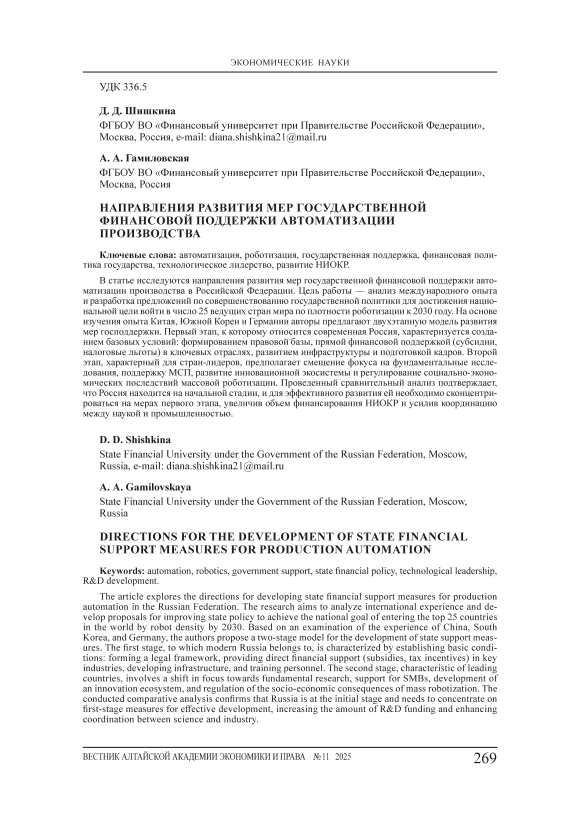 В статье исследуются направления развития мер государственной финансовой поддержки автоматизации производства в Российской Федерации. Цель работы — анализ международного опыта и разработка предложений по совершенствованию государственной политики для достижения национальной цели войти в число 25 ведущих стран мира по плотности роботизации к 2030 году. На основе изучения опыта Китая, Южной Кореи и Германии авторы предлагают двухэтапную модель развития мер господдержки. Первый этап, к которому относится современная Россия, характеризуется созданием базовых условий: формированием правовой базы, прямой финансовой поддержкой (субсидии, налоговые льготы) в ключевых отраслях, развитием инфраструктуры и подготовкой кадров. Второй этап, характерный для стран-лидеров, предполагает смещение фокуса на фундаментальные исследования, поддержку МСП, развитие инновационной экосистемы и регулирование социально-экономических последствий массовой роботизации. Проведенный сравнительный анализ подтверждает, что Россия находится на начальной стадии, и для эффективного развития ей необходимо сконцентрироваться на мерах первого этапа, увеличив объем финансирования НИОКР и усилив координацию между наукой и промышленностью.