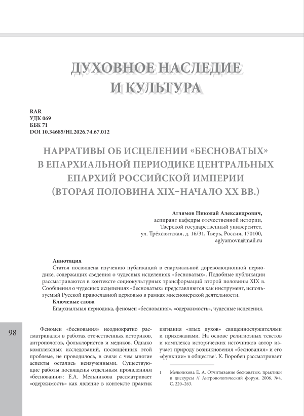 Нарративы об исцелении «бесноватых» в епархиальной периодике центральных епархий Российской империи (вторая половина XIX–начало XX вв.)