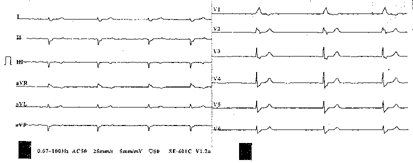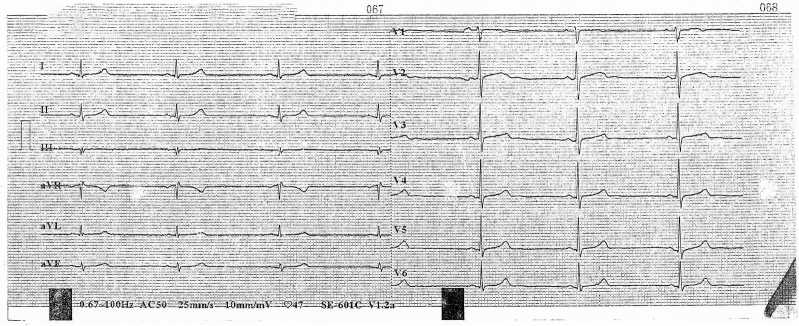Рис. 3. ЭКГ покоя женщины 46 лет. Артериальное давление 100/60 мм рт.ст. Выраженная синусовая брадикардия с ЧСС = 41 в 1 минуту (RR = 1,45 c). Горизонтальное положение электрической оси сердца. Смещение переходной зоны вправо. Признаки увеличения правого желудочка / Fig. 3. Resting ECG of a 46-year-old woman. Blood pressure 100/60 mmHg. Marked sinus bradycardia with HR = 41 per minute (RR = 1.45 s). Horizontal position of the electrical axis of the heart. Rightward shift of the transition zone. Signs of right ventricular enlargement.