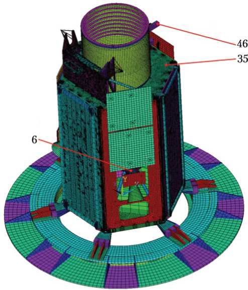Общий вид КЭМ КА с оснасткой и расположением контрольных точек, которые будут использованы в разделе статьи с примером работы методики, представлен на рис. 1. Модель состоит из 265 тысяч узлов. Диапазон модального расчёта составляет 0…200 Гц. В этом диапазоне расположены 670 собственных частот конструкции. Диапазон гармонического расчёта составляет 5…150 Гц.