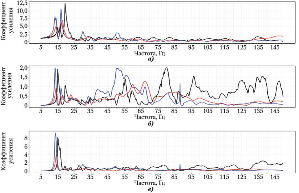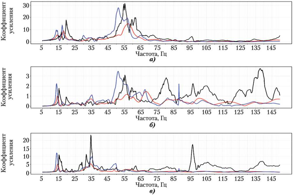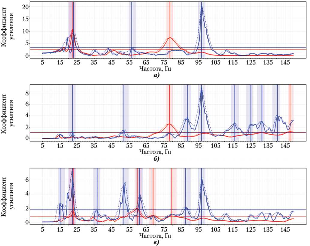 Рис. 3. Пример типовых амплитудно-частотных характеристик (АЧХ): a, б, в — отклики по осям X, Y, Z соответственно; =% — расчётная АЧХ; =% — экспериментальная АЧХ (рисунок создан автором)